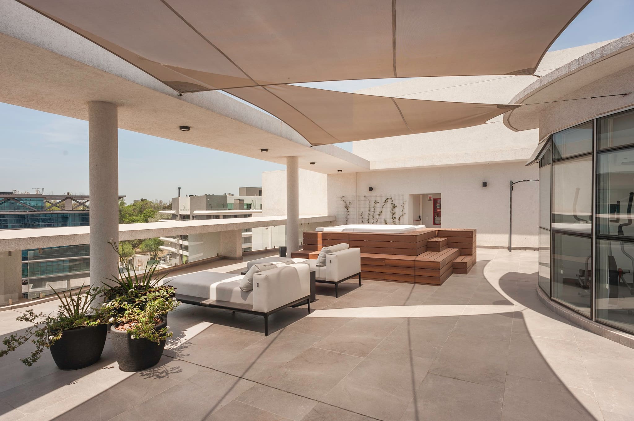 Terraza amplia Multipropósito que cuenta con 2 jacuzzis y un gimnasio.