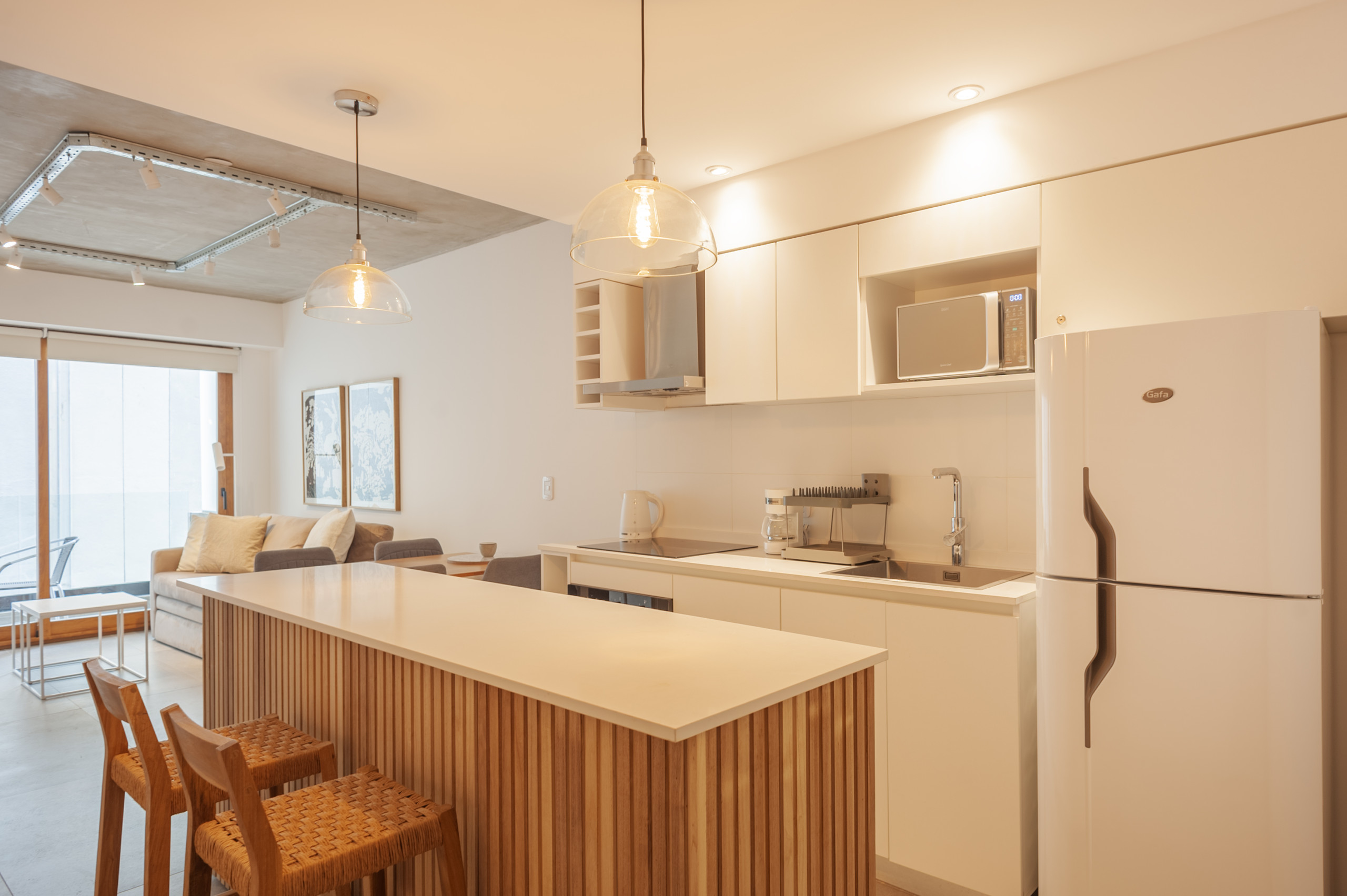 A cozinha americana, de vitrocerâmica, está equipada com geladeira, micro-ondas, forno, congelador, louça/talheres, utensílios/cozinha, cafeteira e torradeira.